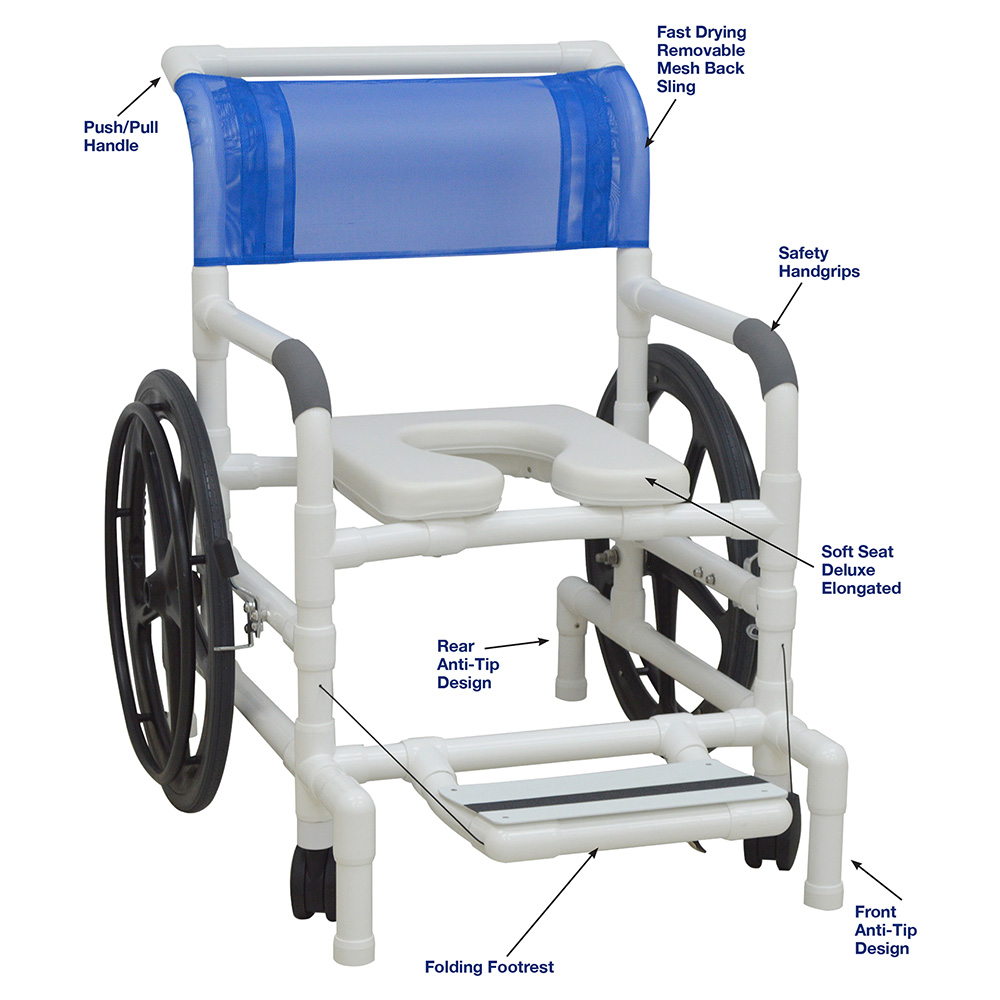Healthcare Grade, Deluxe Elongated Open Front Soft Seat Enhances Resident Comfort, Safety Handgrips And Fast Drying Removable Mesh Back/Sling, Rust Free Frame, User Friendly Self Storing Folding Footrest Prevents Foot Dragging And Entrapment, Dual Safety Hand Brakes, Anti-Tip Design, ReinForced At All Stress Related Areas, Excellent For Transportation.
