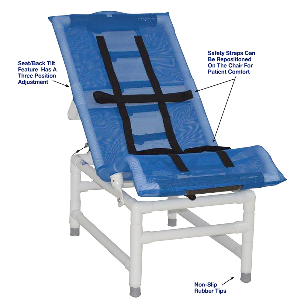 Healthcare Grade, Reinforced At All Stress Related Areas, Three Position Adjustment Seat/Back Tilts 30° - 70°, Adjustable Safety Straps Hold And Secure Individual In Place, Mesh Vinyl Sling Drains Well And Removes Easily For Washing, Full Head And Trunk Support, Lightweight Rust Proof Frame.