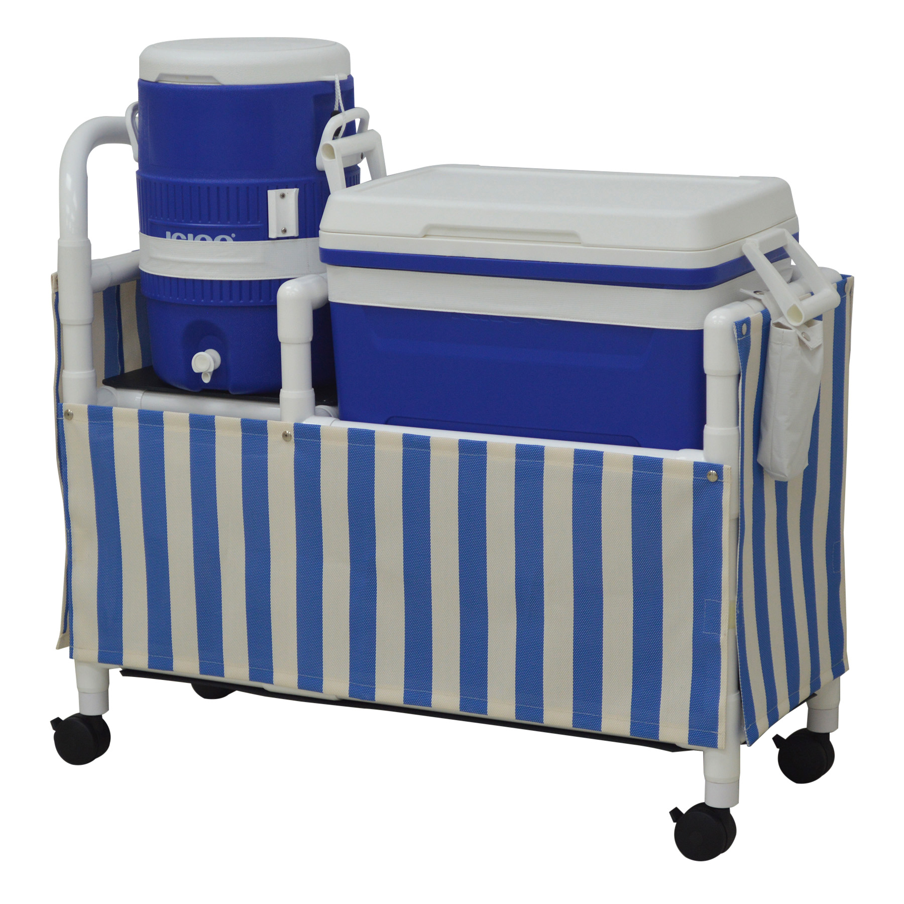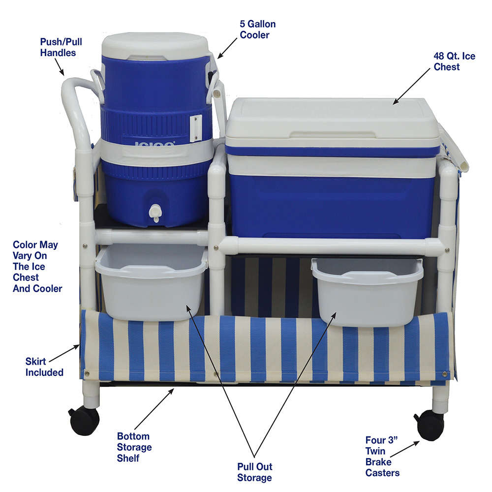 Healthcare Grade, Reinforced At All Stress Related Areas, Hydration/Ice Cart With Royal Café Designer Mesh Skirt Cover Panels, 48 Quart Ice Chest, 5 Gallon Water Cooler, Ice Scoop, 2 Pull Out Storage, Storage Shelf.