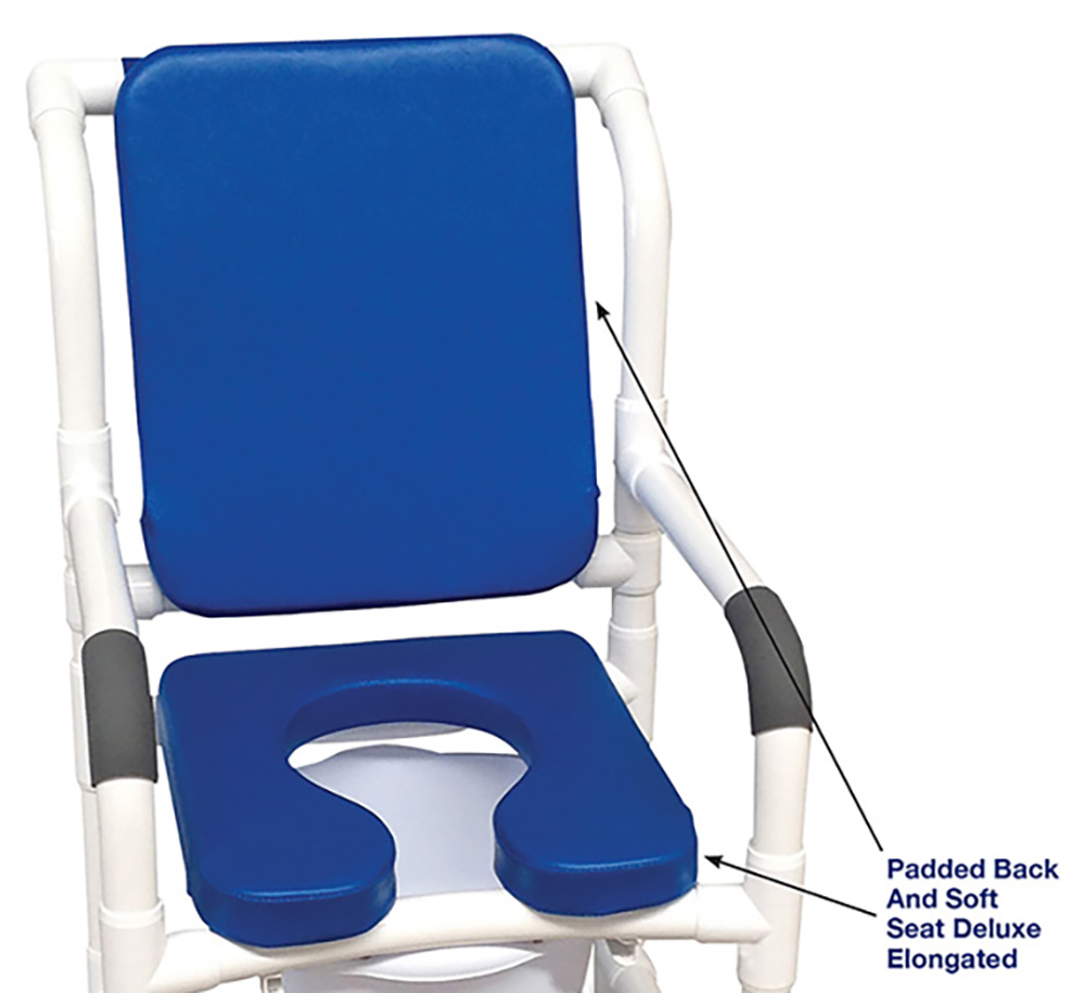 Shower Chair With Blue Soft Seat Deluxe Elongated, Cushion Back And Square Pail