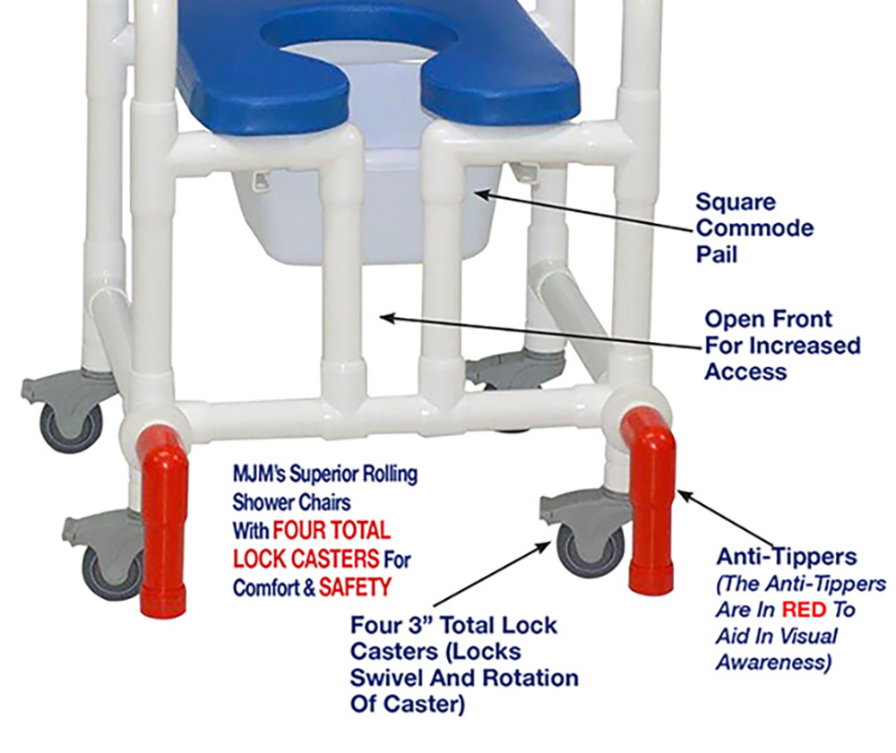 Healthcare Grade, Deluxe Elongated Open Front Soft Seat Enhances Resident Comfort, Cushion Padded Back, True Vertical Open Front, 10 QT Slide Out Commode Pail, Front Anti-Tippers, Safety Handgrips, Push/Pull Handle, Reinforced At All Stress Related Areas.