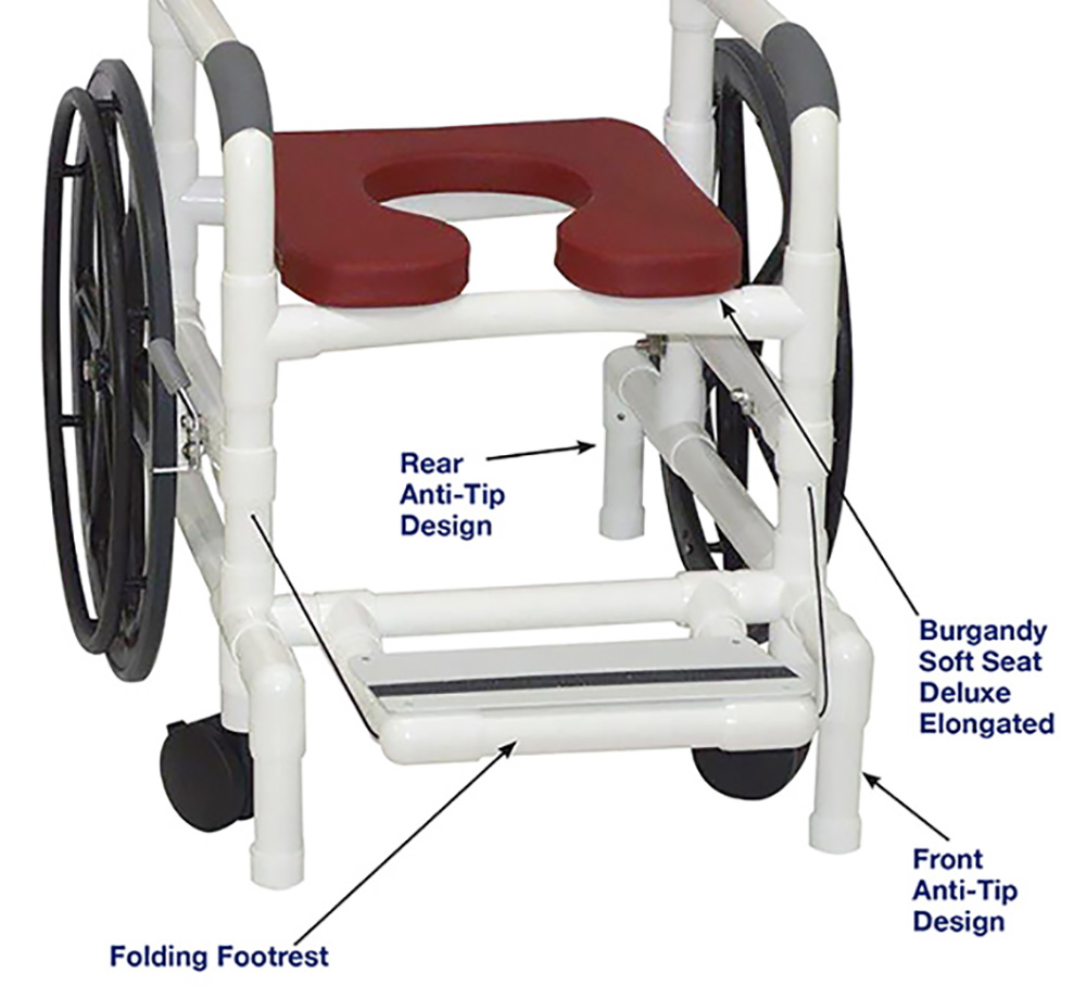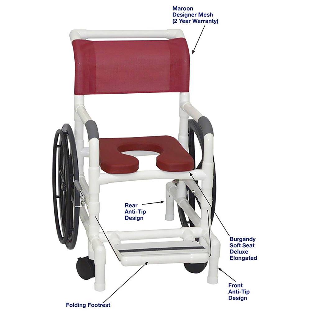 Healthcare Grade, Deluxe Elongated Open Front Soft Seat Enhances Resident Comfort, Safety Handgrips And Fast Drying Removable Mesh Back/Sling, Rust Free Frame, User Friendly Self Storing Folding Footrest Prevents Foot Dragging And Entrapment, Dual Safety Hand Brakes, Anti-Tip Design, Reinforced At All Stress Related Areas, Excellent For Transportation.