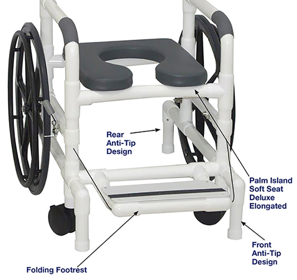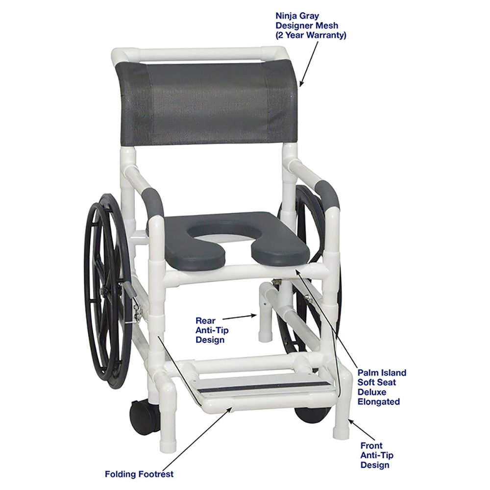 Healthcare Grade, Deluxe Elongated Open Front Soft Seat Enhances Resident Comfort, Safety Handgrips And Fast Drying Removable Mesh Back/Sling, Rust Free Frame, User Friendly Self Storing Folding Footrest Prevents Foot Dragging And Entrapment, Dual Safety Hand Brakes, Anti-Tip Design, Reinforced At All Stress Related Areas, Excellent For Transportation.