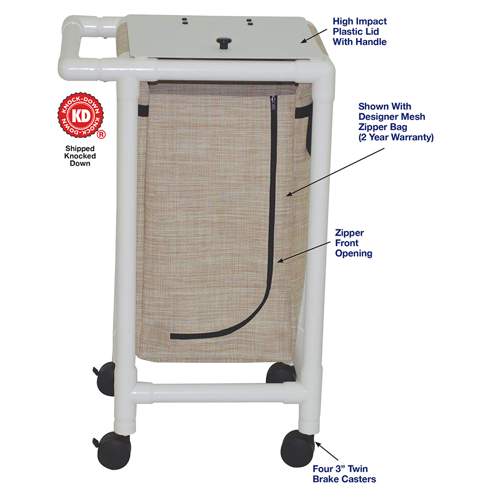 All MJM's Zipper Front Opening Hampers Help Prevent Back Injuries. Shown With Designer Mesh Zipper Bag (2 Year Warranty).