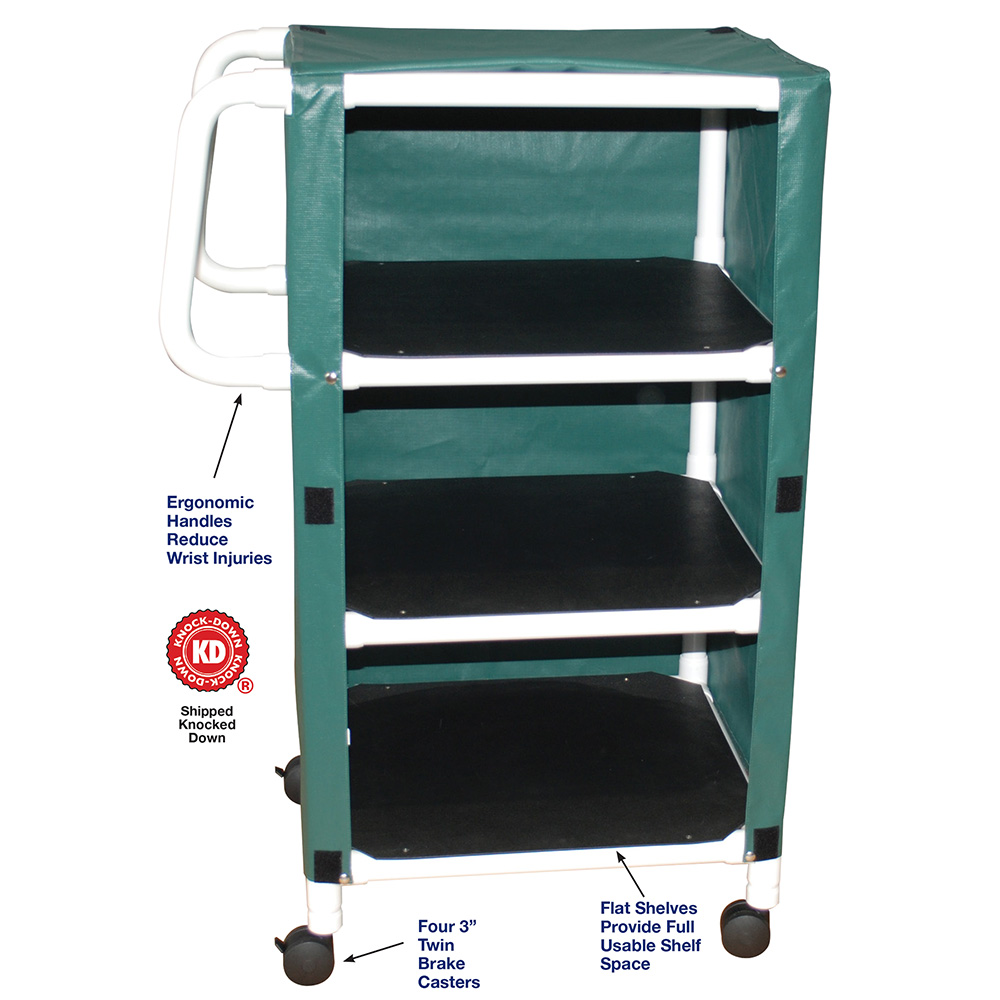 Healthcare Grade, All Casters Are Reinforced, Flat Shelves Provide Full Usable Shelf Space, Velcro Closure, Ergonomic Handles Help Reduce Wrist Injuries.