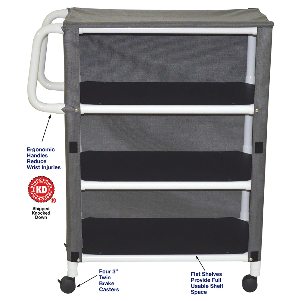 Healthcare Grade, All Casters Are Reinforced, Flat Shelves Provide Full Usable Shelf Space, Velcro Closure, Ergonomic Handles Help Reduce Wrist Injuries.