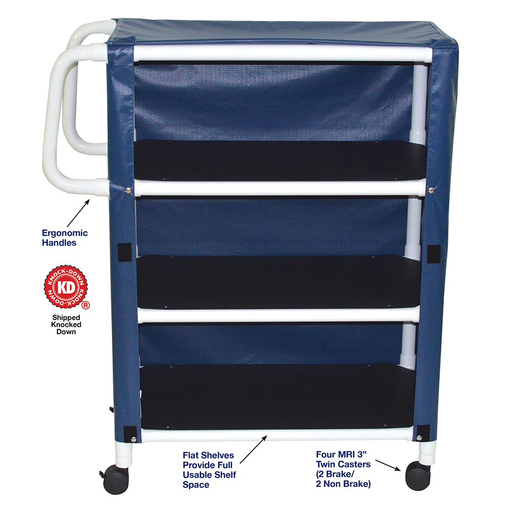 Healthcare Grade, All Casters Are Reinforced, Flat Shelves Provide Full Usable Shelf Space, Velcro Closure, Ergonomic Handles Help Reduce Wrist Injuries.