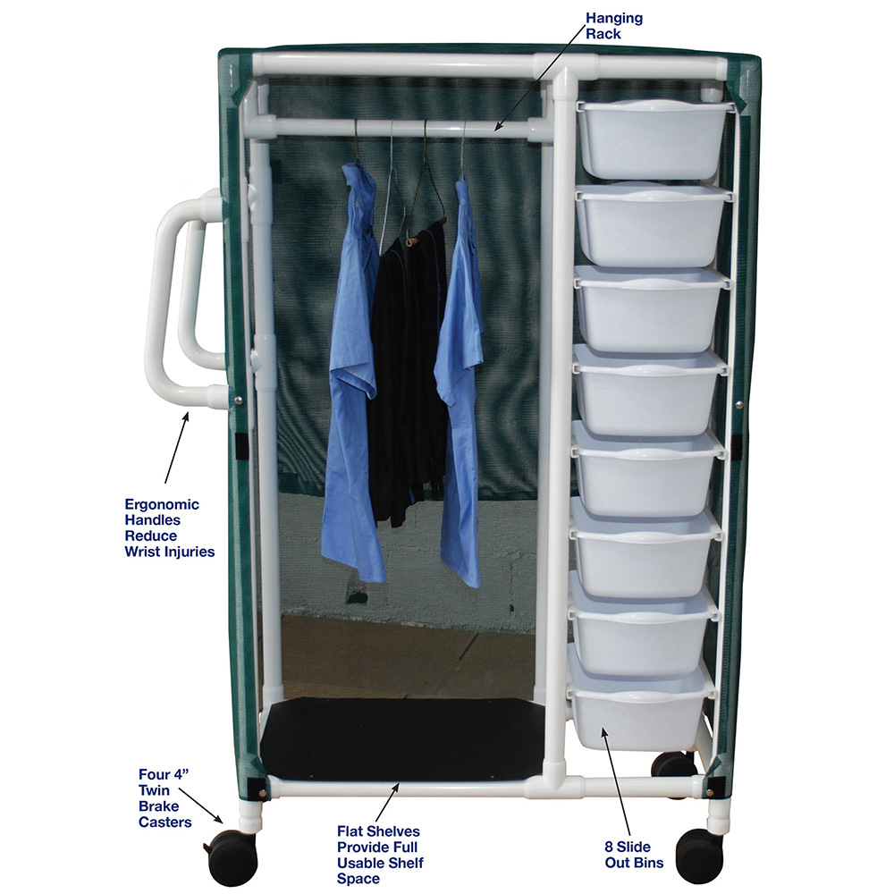 Healthcare Grade, All Casters Are Reinforced, Flat Shelf Provides Full Usable Shelf Space, Distribution Cart For Every Need, Reinforced At All Stress Related Areas, Ergonomic Handles Help Reduce Wrist Injuries, Combo Cart With 8 Bins And Hanging Rack.