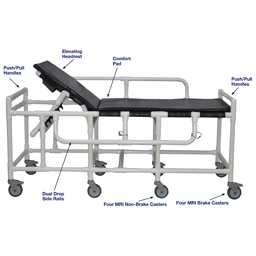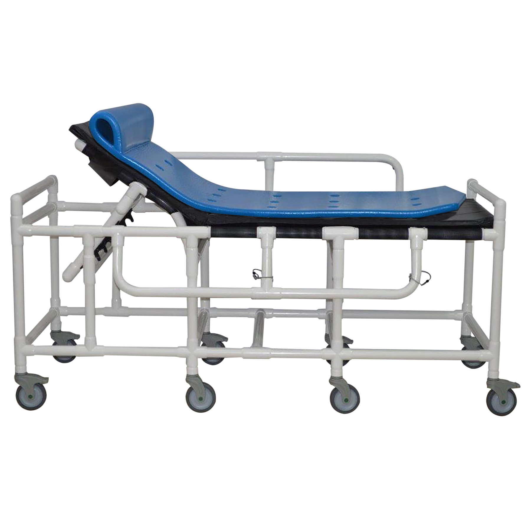 Healthcare Grade, Reinforced At All Stress Related Areas, Shower Gurney With Five Position Elevating Headrest, Sling Gurney Ideal For Transporting, Dual Drop Side Rails, Comes With Comfort Pad, Rust Free Frame, All Casters Are Reinforced.