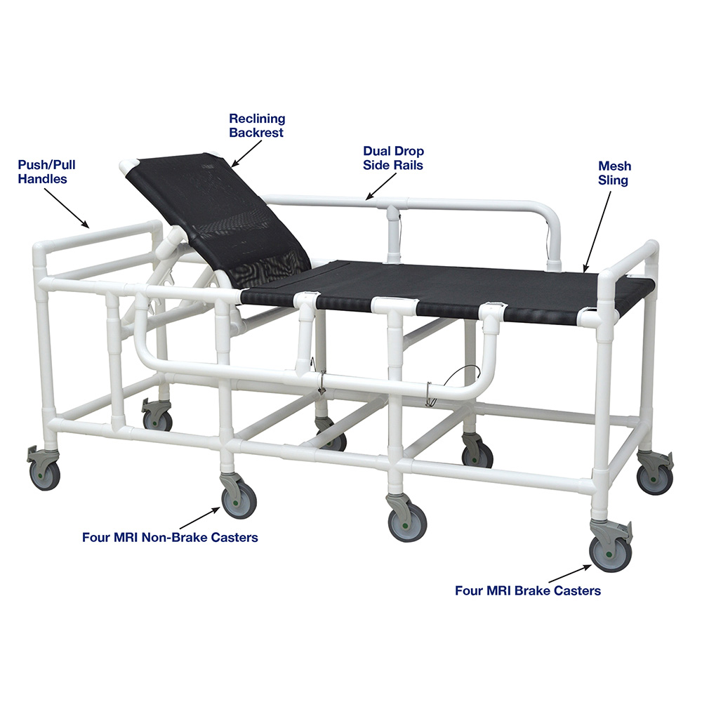 Healthcare Grade, Reinforced At All Stress Related Areas, Bariatric Sling Gurney With Five Position Elevating Headrest (Without Drain Pan). Five Position MRI Sling Gurney.