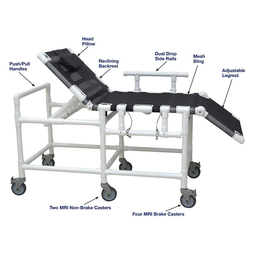 Healthcare Grade, Reinforced At All Stress Related Areas, Leg Section Can Adjust To Numerous Positions, Sling Gurney With Five Position Elevating Headrest (Without Drain Pan). Five Position MRI Sling Gurney.