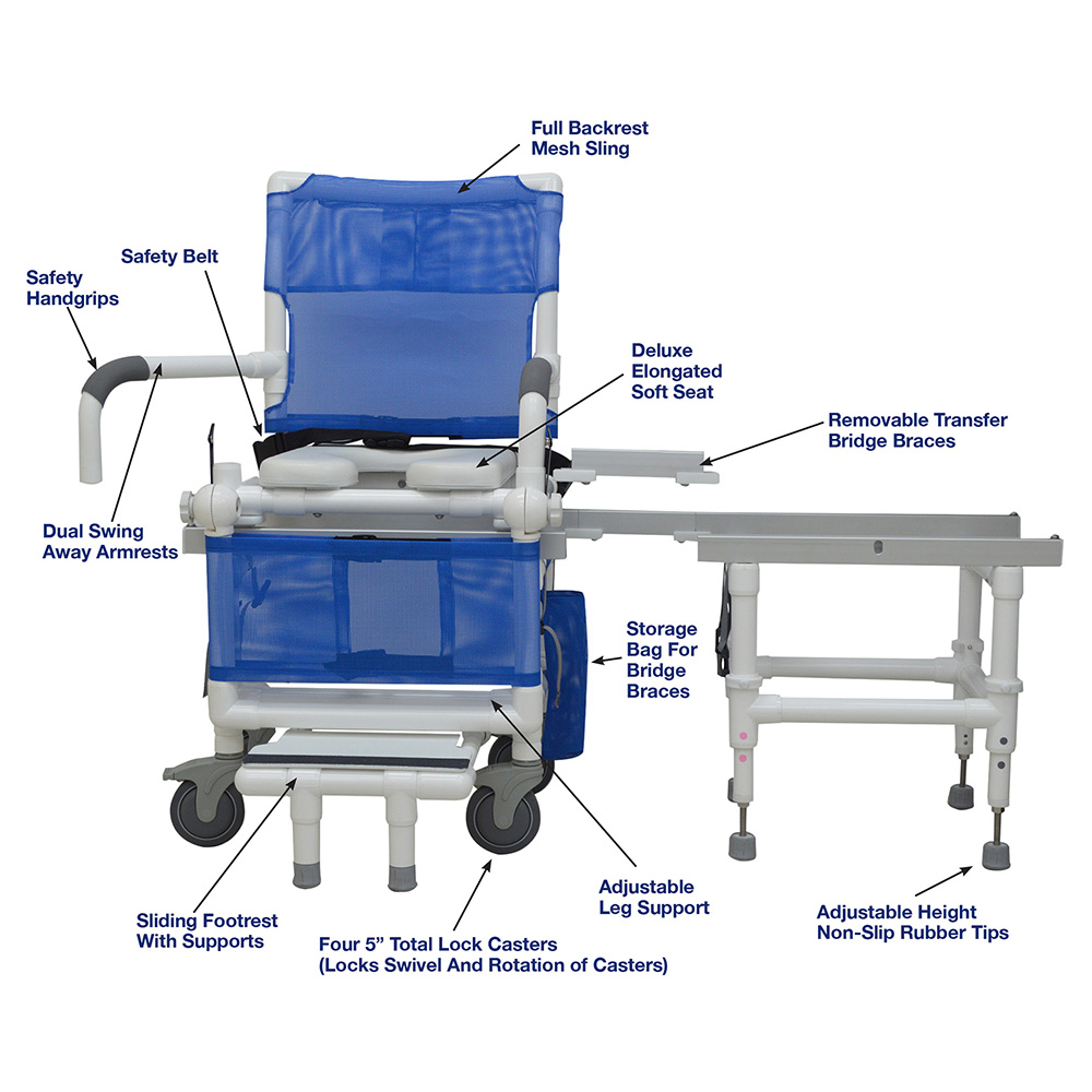 MJM’s Dual Shower/Transferchairs Reduce The Need For Unnecessary Transfers Thus Creating A Safe And Secure Environment For Toileting And Bathing. Our Unique Removable Transfer Bridge Braces Allow For The Tub/Shower Section Of The Chair To Fit Completely In The Tub Or Shower Stall Permitting Closure Of A Shower Curtain Or Shower Door For Privacy.