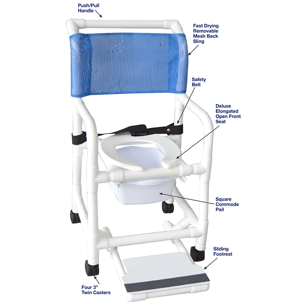 Healthcare Grade, Deluxe Elongated Open Front Seat Enhances Resident Comfort, Push/Pull Handle And Fast Drying Removable Mesh Back/Sling, Square Pail, Safety Belt, Sliding Footrest And Reinforced At All Stress Related Areas.