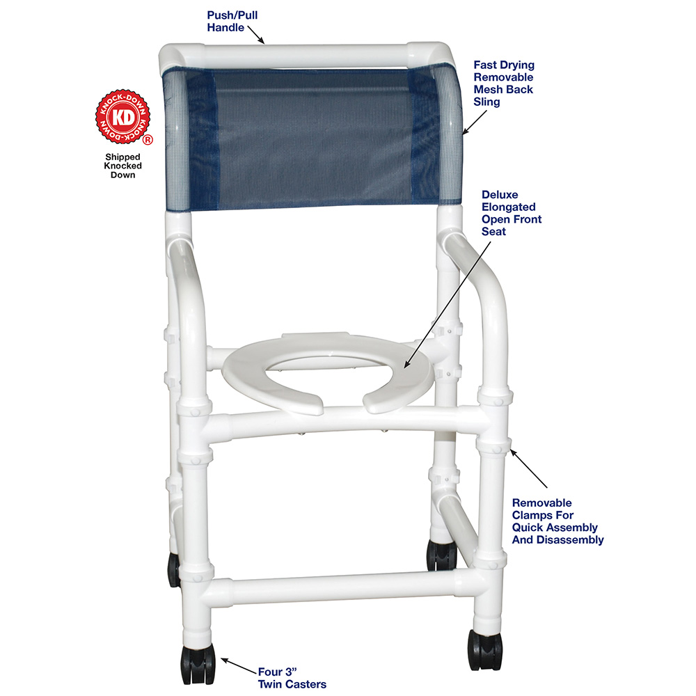 Healthcare Grade, Deluxe Elongated Open Front Seat Enhances Resident Comfort, Push/Pull Handle And Fast Drying Removable Mesh Back/Sling, Reinforced At All Stress Related Areas.