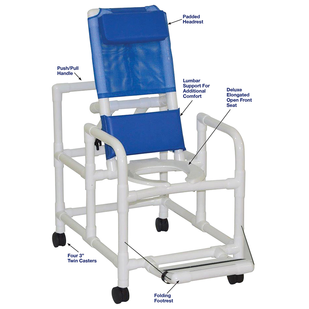Healthcare Grade, Deluxe Elongated Open Front Seat Enhances Resident Comfort, Fast Drying Removable Mesh Back/Sling, User Friendly Self Storing Folding Footrest Prevents Foot Dragging And Entrapment, Reinforced At All Stress Related Areas.