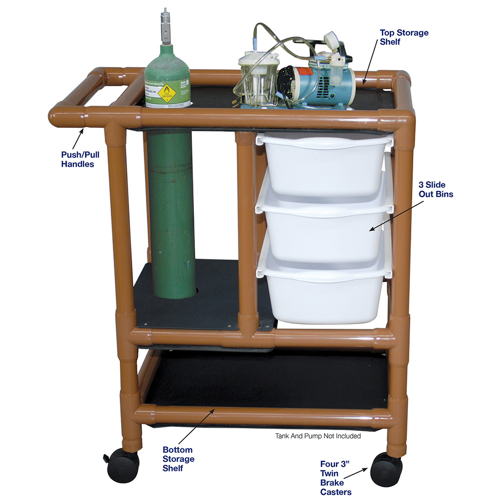 Healthcare Grade, Reinforced At All Stress Related Areas, Holds E Series Oxygen Cylinders, Top Shelf Is Used For Suction Machine, 3 Pull Out Storage Tubs, Light Weight And Easy To Maneuver.