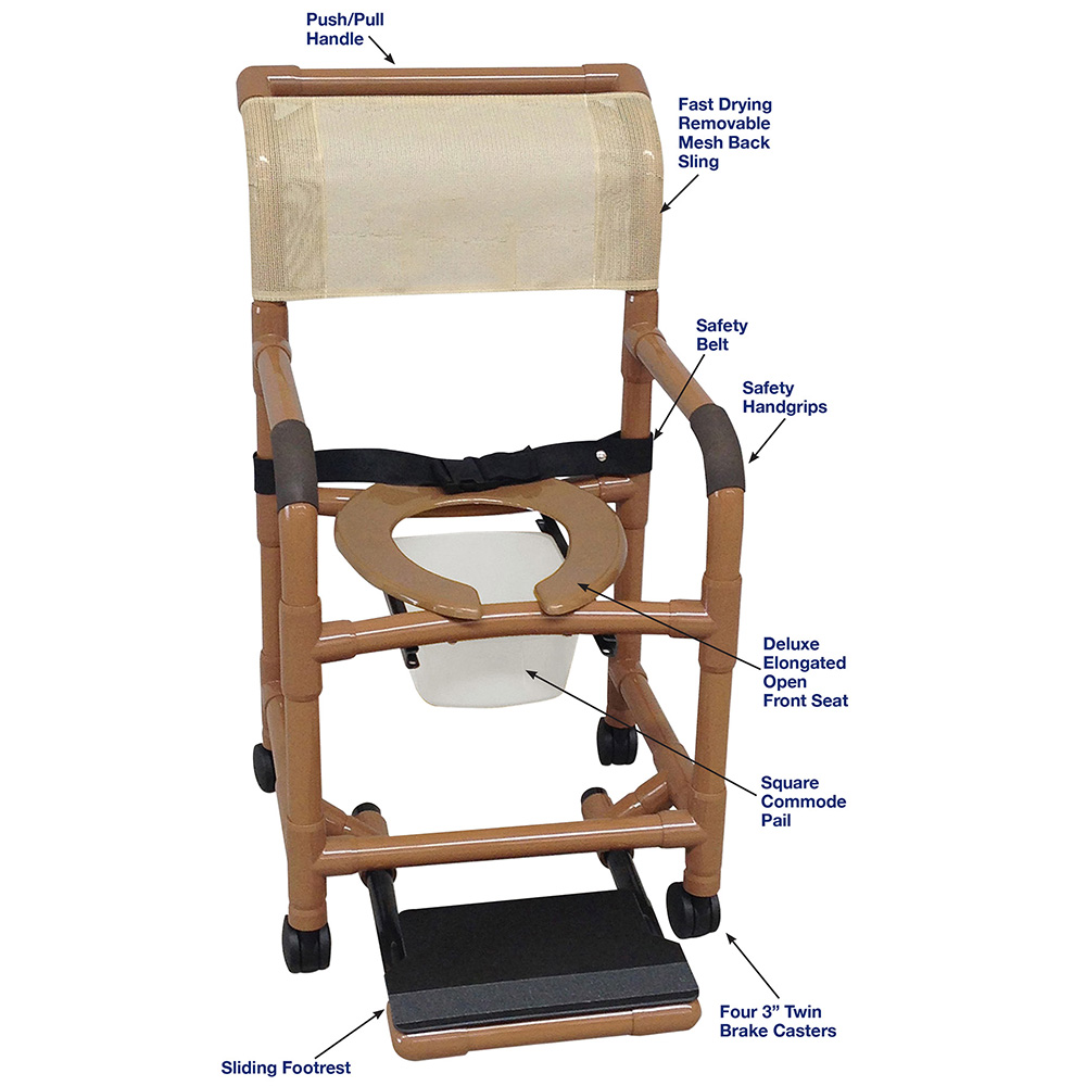 Healthcare Grade, Deluxe Elongated Open Front Seat Enhances Resident Comfort, Safety Handgrips, Push/Pull Handle And Fast Drying Removable Mesh Back/Sling, Safety Belt, Square Commode Pail, Sliding Footrest And Reinforced At All Stress Related Areas.