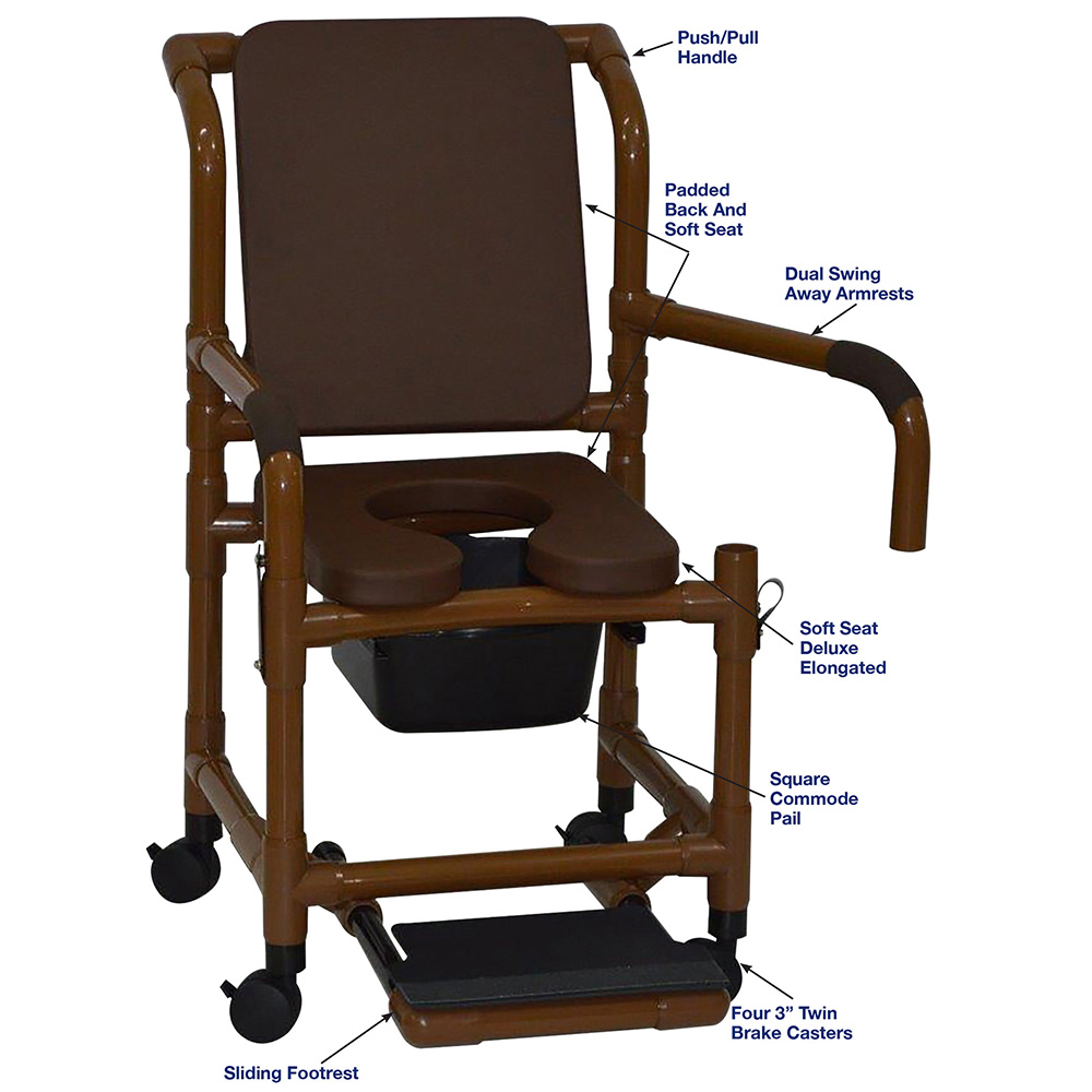 WoodTone Shower Chair With Soft Seat Deluxe Elongated, Cushion Back, Dual Swing Away Armrests, Square Pail, And Sliding Footrest