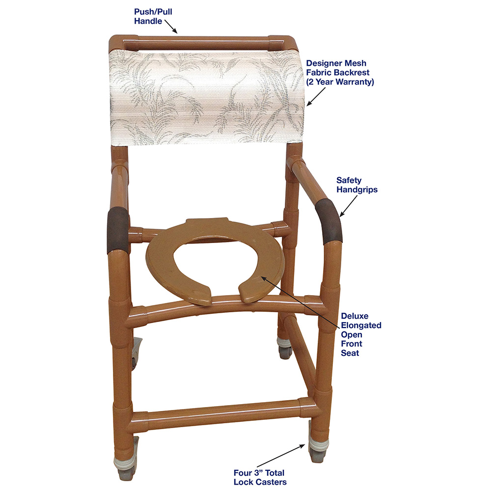 Healthcare Grade, Deluxe Elongated Open Front Seat Enhances Resident Comfort, Anti-Slip Handgrips, Push/Pull Handle And Fast Drying Removable Mesh Back/Sling, Reinforced At All Stress Related Areas, MJM Standard Reinforced Caster System Provides A Safer Transfer for Care Giver and Patient.