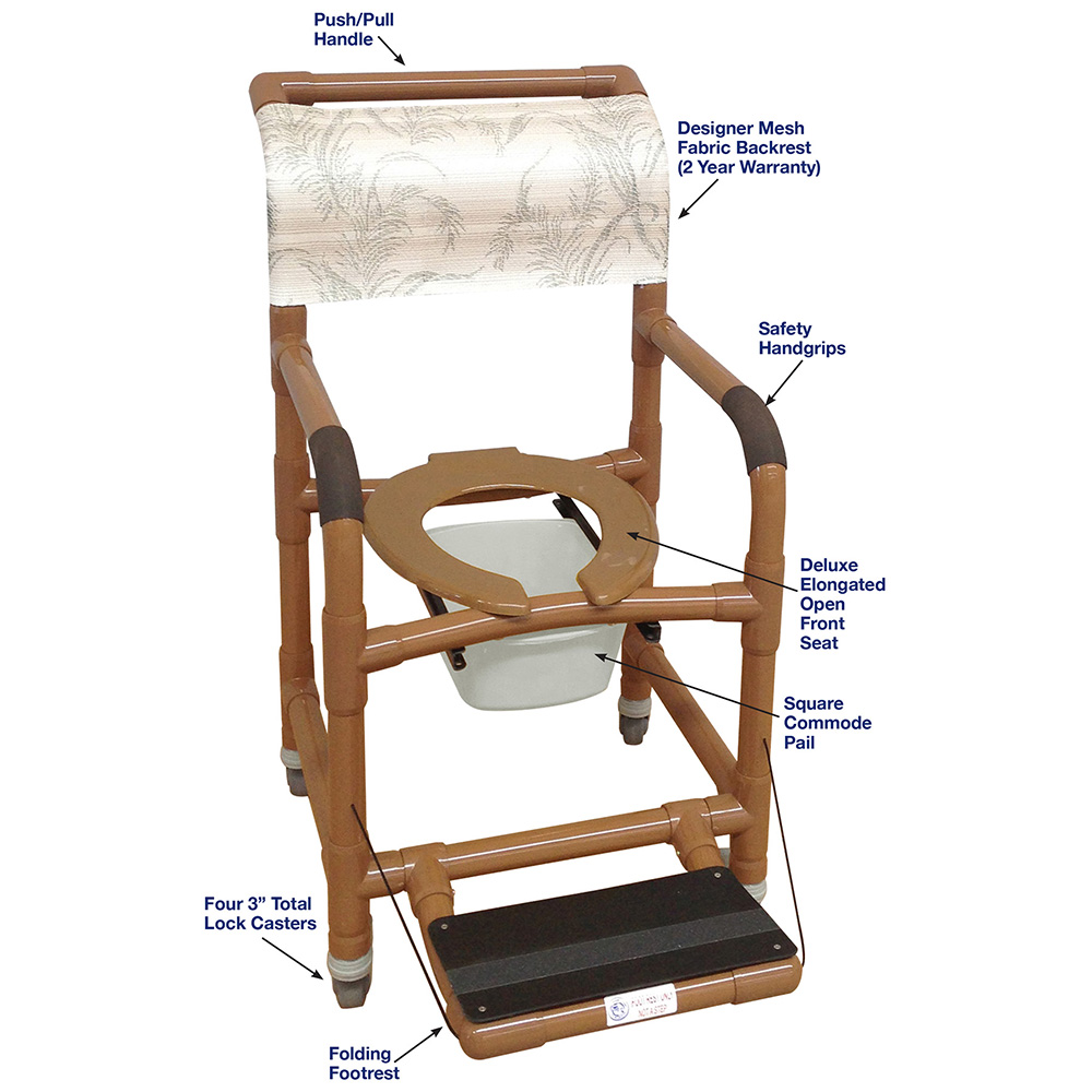 Healthcare Grade, Deluxe Elongated Open Front Seat Enhances Resident Comfort, Anti-Slip Handgrips, Push/Pull Handle And Fast Drying Removable Mesh Back/Sling, Reinforced At All Stress Related Areas, MJM Standard Reinforced Caster System Provides A Safer Transfer for Care Giver and Patient.