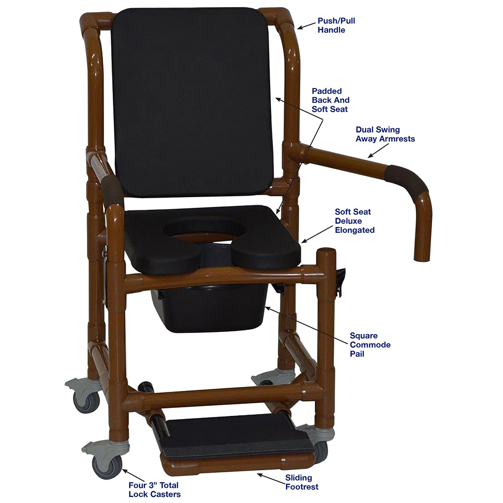 Healthcare Grade, Deluxe Elongated Open Front Soft Seat Enhances Resident Comfort, Cushion Padded Back, Dual Swing Away Armrests 10 QT Slide Out Commode Pail, Push/Pull Handle, Slidng Footrest Reinforced At All Stress Related Areas.