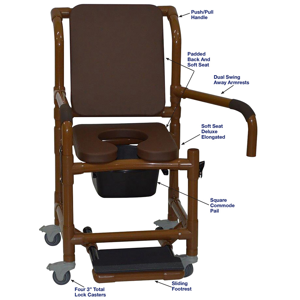 WoodTone Shower Chair With Total Lock Casters, Soft Seat Deluxe Elongated, Cushion Back, Dual Swing Away Armrests, Square Pail, And Sliding Footrest