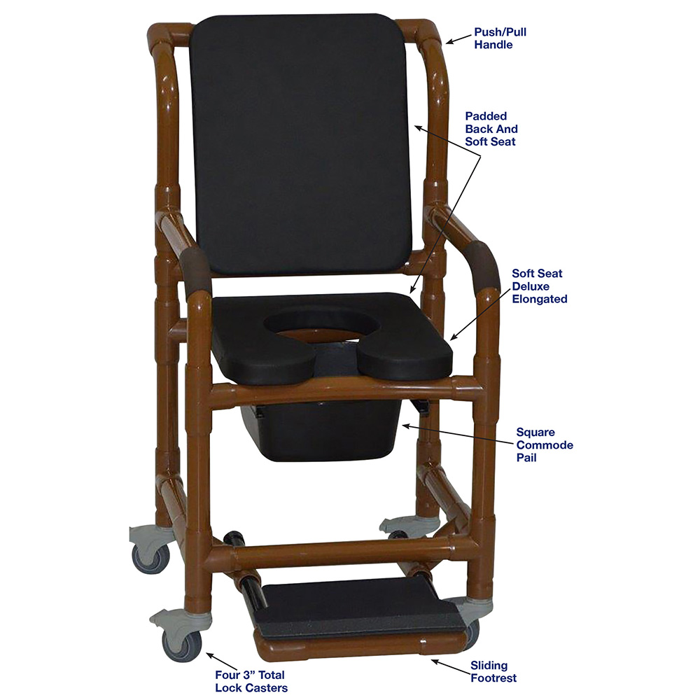 Healthcare Grade, Deluxe Elongated Open Front Soft Seat Enhances Resident Comfort, Cushion Padded Back, 10 QT Slide Out Commode Pail, Push/Pull Handle, Slidng Footrest, Reinforced At All Stress Related Areas.