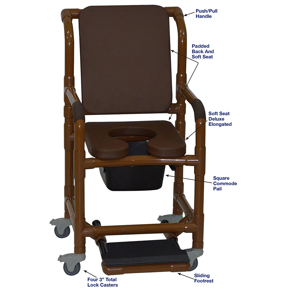 WoodTone Shower Chair With Total Lock Casters, Soft Seat Deluxe Elongated, Cushion Back, Square Pail, And Sliding Footrest