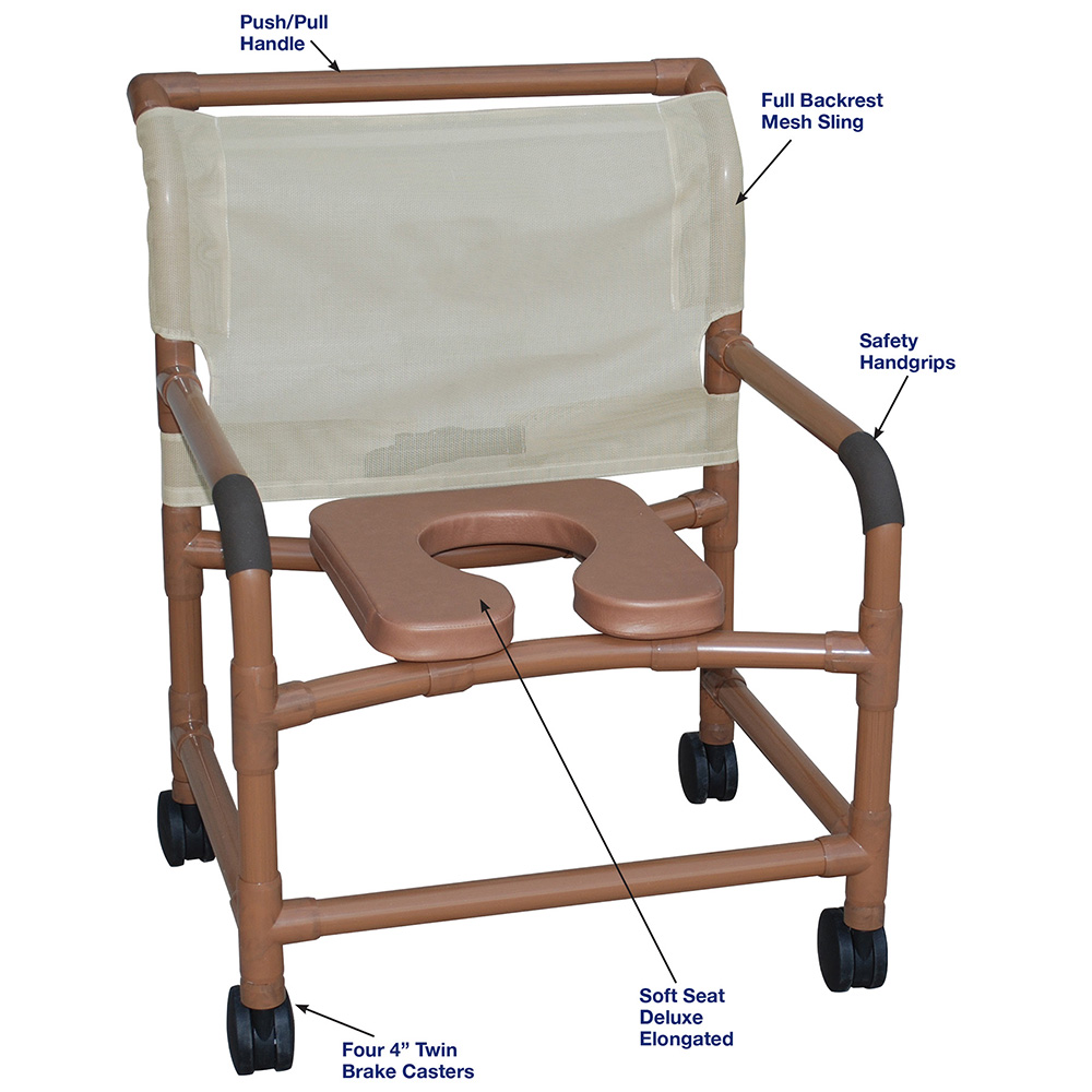 Healthcare Grade, Deluxe Elongated Open Front Soft Seat Enhances Resident Comfort, Safety Handgrips, Push/Pull Handle And Fast Drying Mesh Back/Sling, Reinforced At All Stress Related Areas.