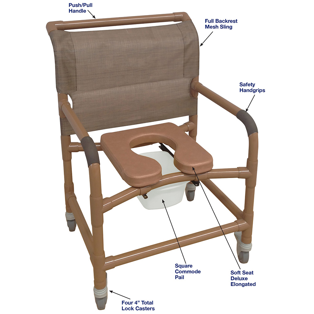 Healthcare Grade, Deluxe Elongated Open Front Soft Seat Enhances Resident Comfort, Safety Handgrips, Push/Pull Handle, Square Commode Pail, Total Lock Casters, Fast Drying Mesh Back/Sling And Reinforced At All Stress Related Areas.